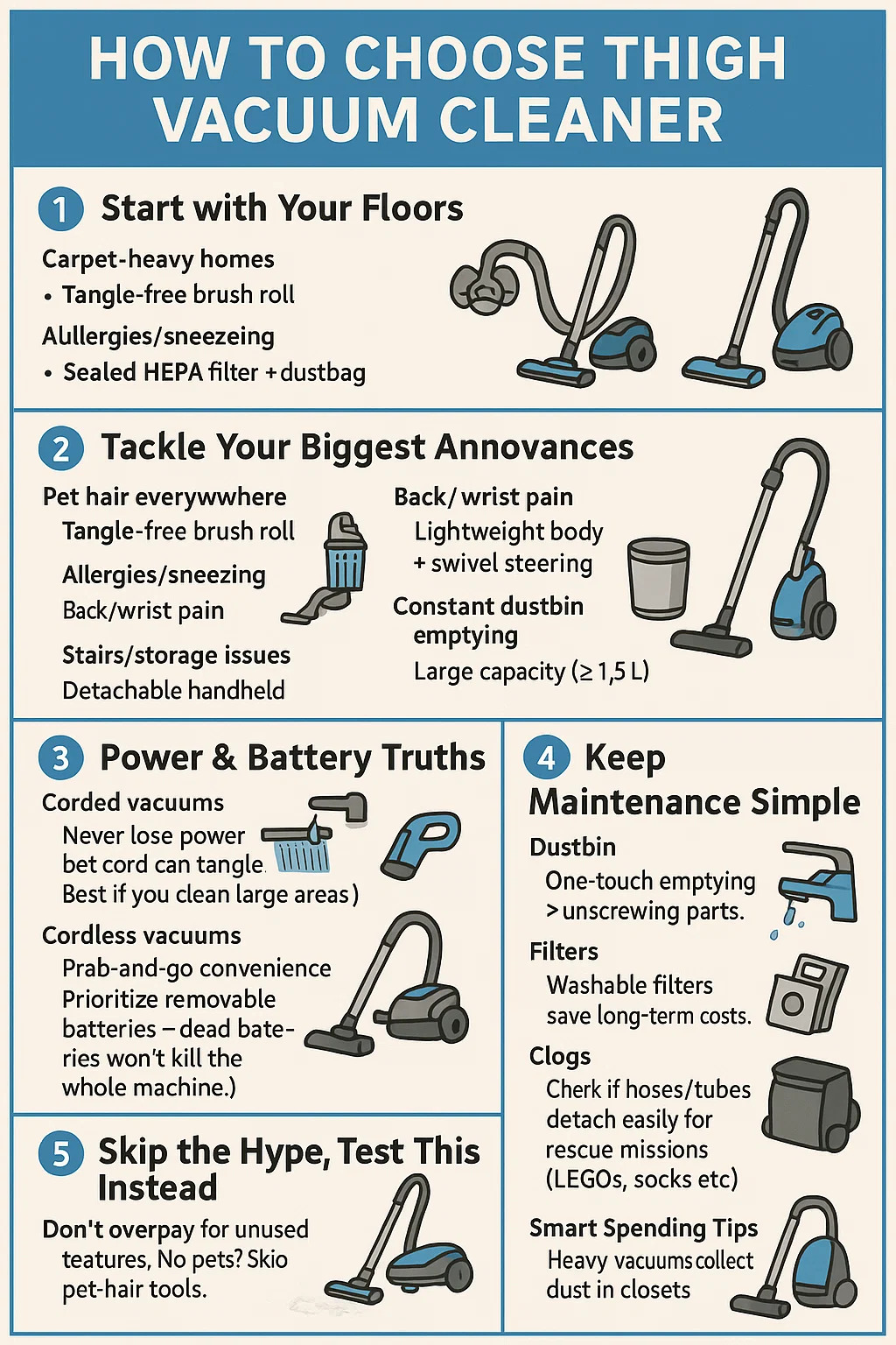 카펫이 많은 집: 섬유 속까지 파고드는 회전 브러시 바(비터 바)가 있는 진공청소기를 찾으세요. 두꺼운 러그에는 높이 조절이 중요합니다.
